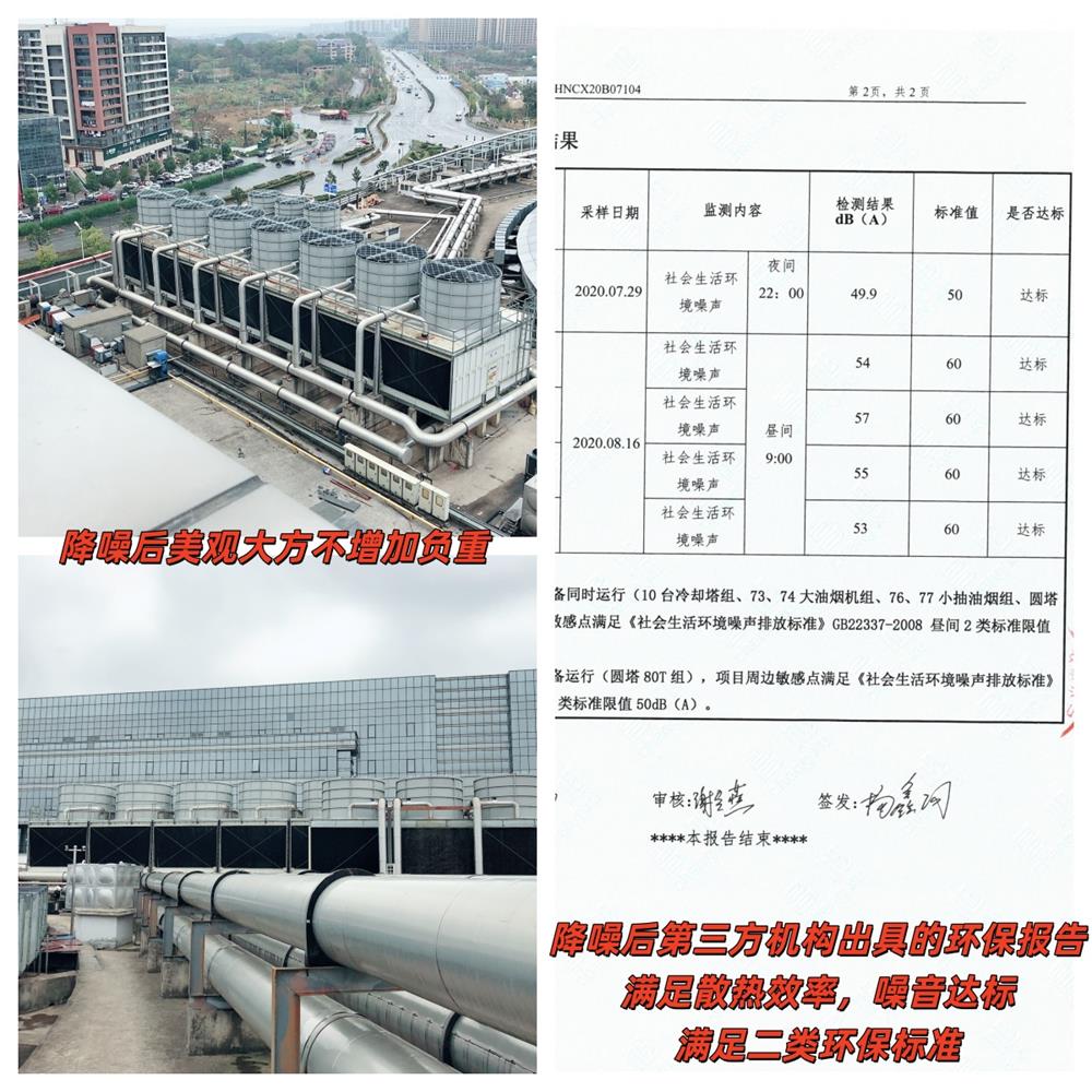 環保性能方面,項目嚴格遵循二類環保標準要求,降噪后委托第三方權威機構進行全面檢測,出具的《環保檢測報告》明確顯示:冷卻塔運行噪音值完全符合二類聲環境功能區標準,白天≤60dB (A)、夜間≤50dB (A),有效解決了噪音擾民問題。同時,通過科學的氣流疏導設計與散熱通道優化,治理過程未對冷卻塔散熱效率造成任何影響,設備制冷性能保持穩定,真正實現 “降噪與散熱并行,環保與實用兼顧”。?